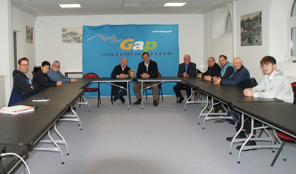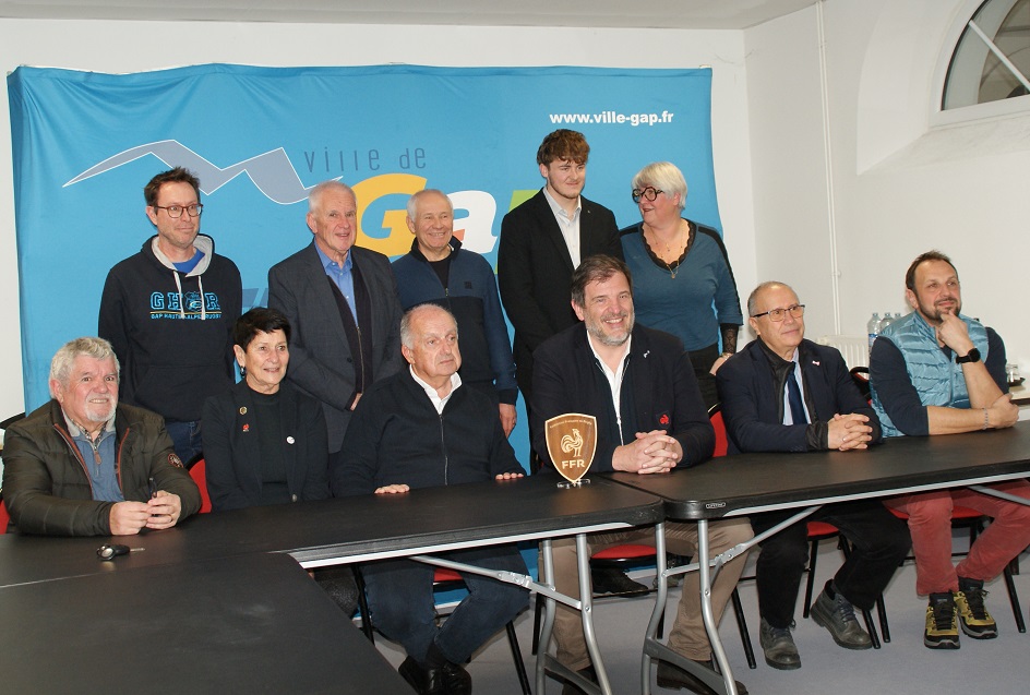 Autour du Maire de la ville et du Président de la fédération, des représentants de la municipalité à sensibilité sportive, les présidents de la Ligue Sud et du Comité Départemental et les représentants du Gap Hautes Alpes Rugby.